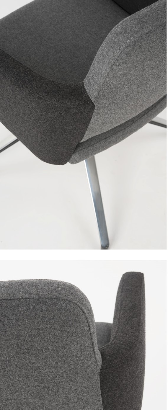 Auf den ersten Blick besticht der Drehsessel ENSE durch seine klare, kubische Form. Er wirkt modern, selbstbewusst und präsent. Die markante Trennung von Sitz- und Rückenlehne verleiht ihm eine starke Kontur, die in jeder Umgebung ein Statement setzt. Doch bei genauerem Hinsehen offenbart er eine überraschende Leichtigkeit. Das filigrane Vierfussgestell aus pulverbeschichtetem Metall lässt die grosszügige Sitzschale beinahe schweben. Es ist dieses spannende Zusammenspiel aus Volumen und Zartheit, das den Sessel so einzigartig macht.