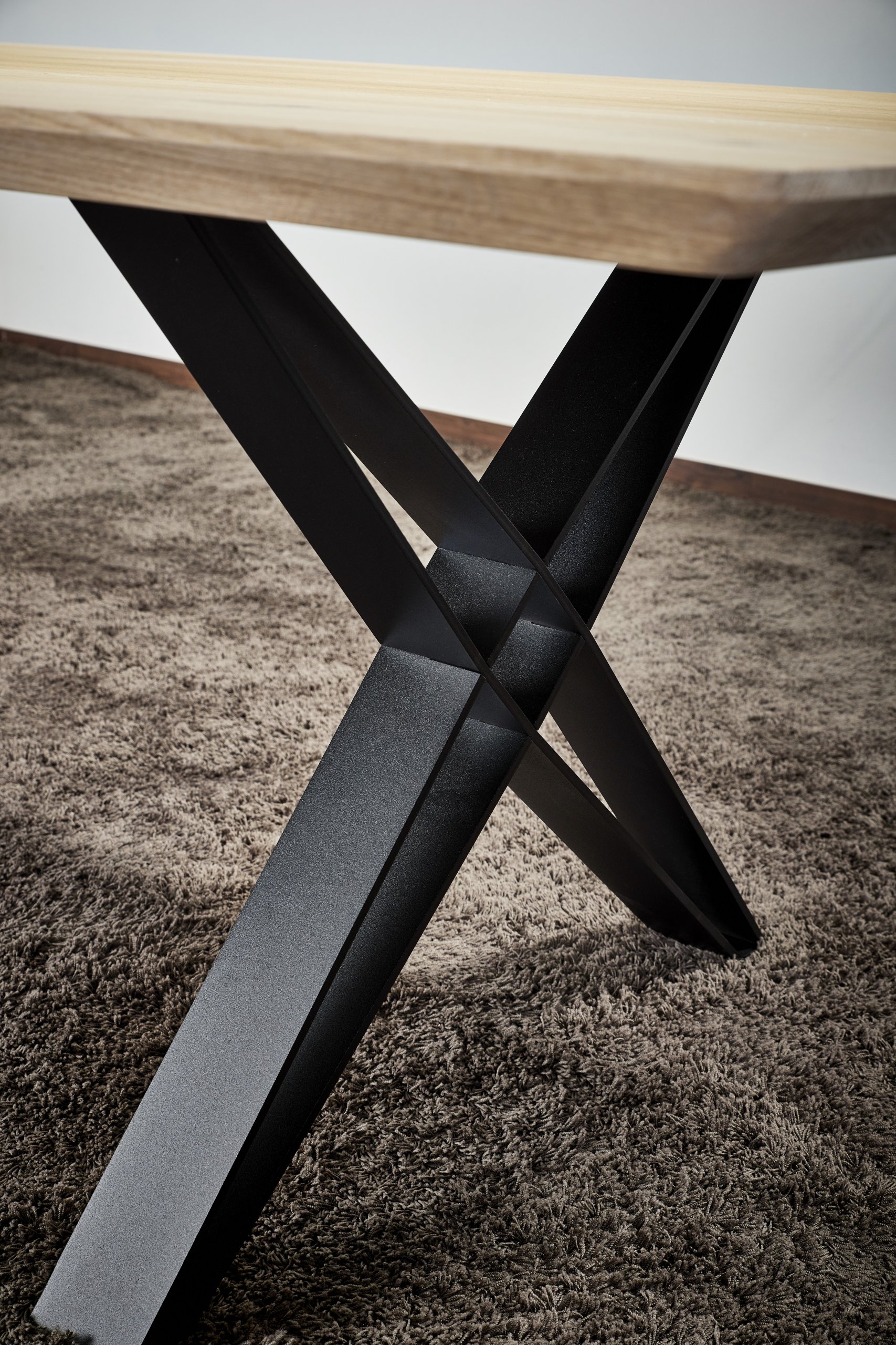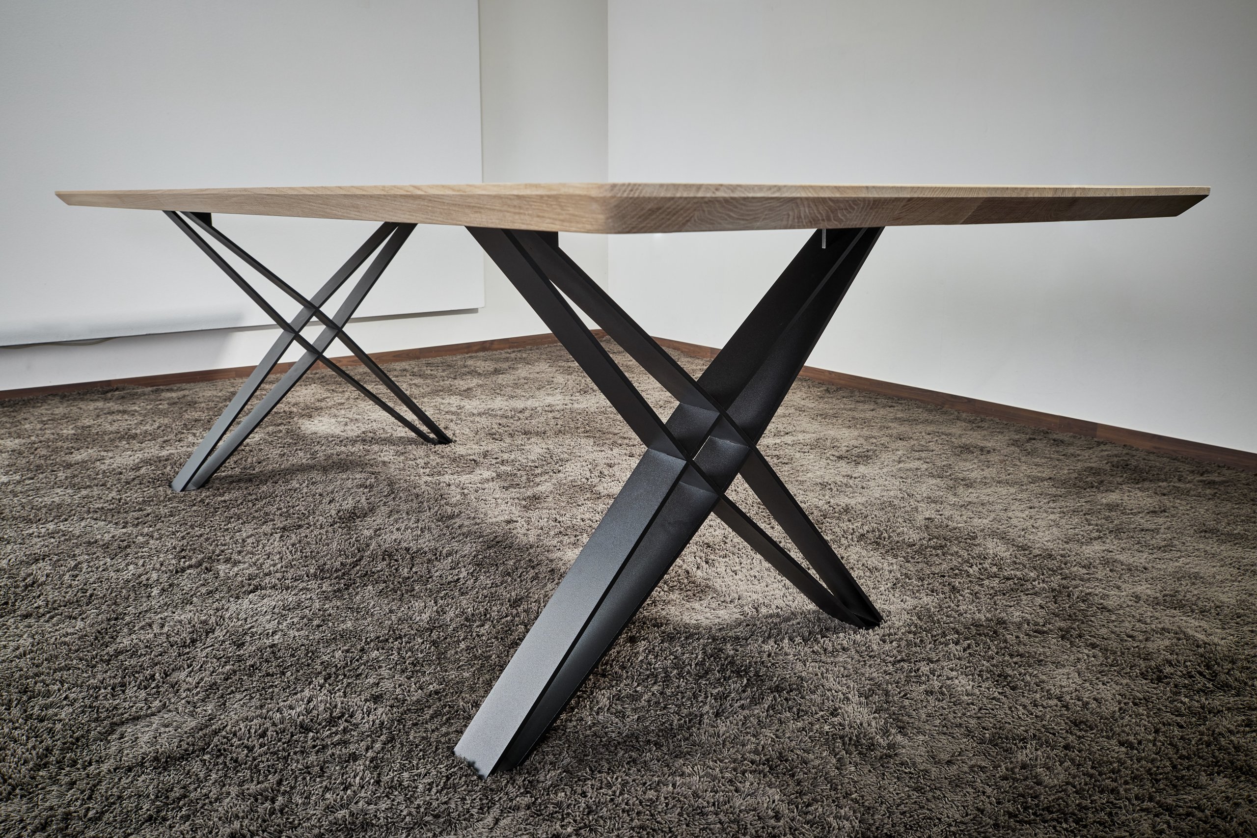 Ein echter Blickfang für Ihr Esszimmer: Unser Esstisch Meschede mit Schweizer Kante wirkt massiv und schlank zugleich! Die 4 cm starke, massive Eichenplatte wird in verschiedenen Ausführungen angeboten: Abgebildet sehen Sie die Bearbeitung mit „Rohholz-Effekt-Lack“. Die Eichenplatte wirkt natürlich und unbearbeitet. Selbstverständlich kann die Tischplatte mit Schweizer Kante auch geölt werden. Die abgebildete Tischplatte hat die Astlöcher sind offen. Gern bieten wir auch eine schwarze Spachtelung oder Zinneinlagen an. Das Design-X als Gestell ist auch ein optisches Highlight und bietet Kniefreiheit. Stahlprofile und Entlastungsrillen auf der Unterseite sind bei unseren Tischplatten mit Schweizer Kante Standard und helfen, das „Verziehen“ zu minimieren. Abgebildet ist eine Tischplatte mit den Abmessungen: 200 x 100 cm. Wählen Sie Ihr Wunschmaß – wir fertigen angepasst an Ihrer vorhandenen Einrichtung!