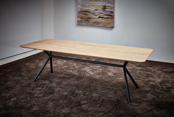 Ein echter Blickfang für Ihr Esszimmer: Unser Esstisch Meschede mit Schweizer Kante wirkt massiv und schlank zugleich! Die 3 cm starke, massive Eichenplatte wird in verschiedenen Ausführungen angeboten: Abgebildet sehen Sie die Bearbeitung mit „Rohholz-Effekt-Lack“. Die Eichenplatte wirkt natürlich und unbearbeitet. Die Astlöcher sind offen. Gern bieten wir auch eine schwarze Spachtelung oder Zinneinlagen an. Kontrastreich ist das Tischgestell in schwarz. Die Formgebung ist auch hier rund und harmoniert perfekt zur abgerundeten Tischplatte. Dieses Modell bieten wir auch in diesen Maßen an: 200 x 100 cm und 220 x 100 cm.