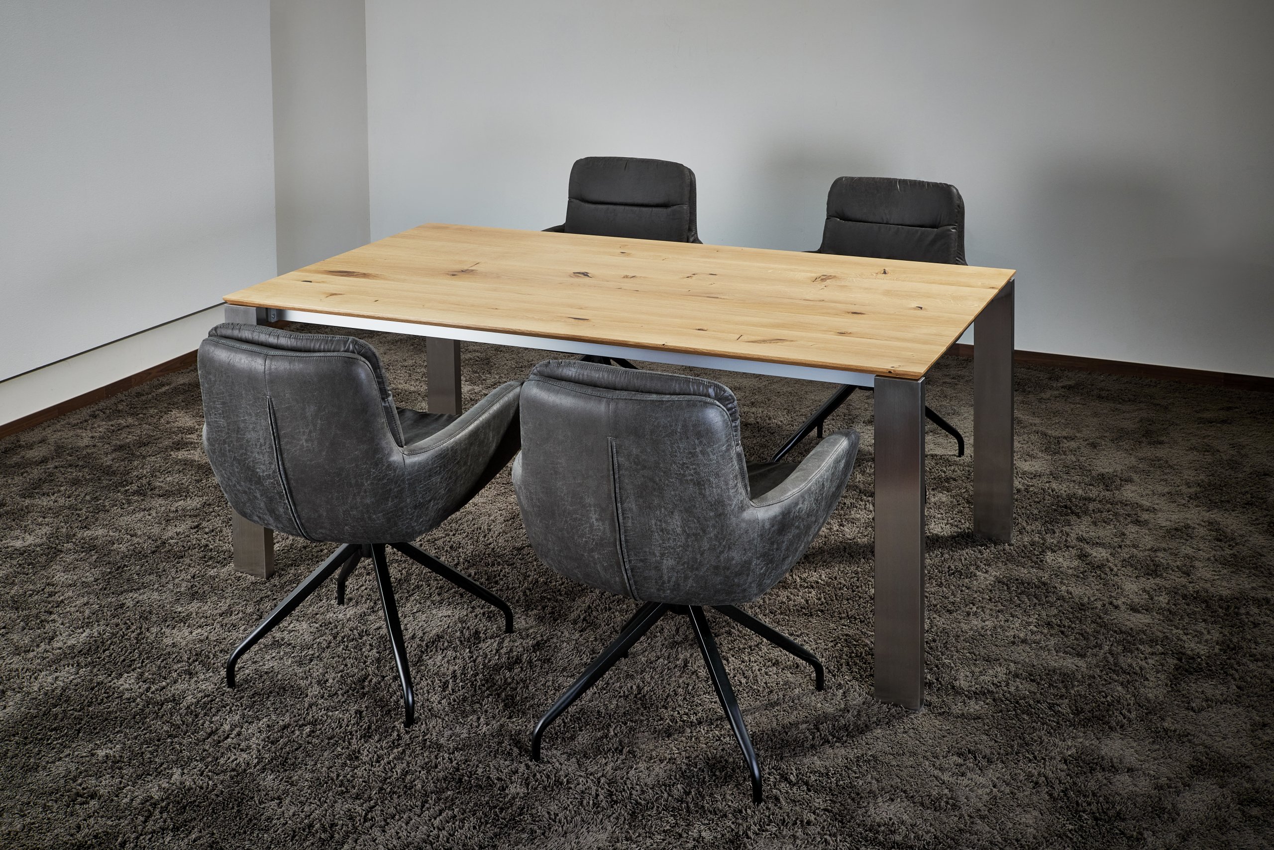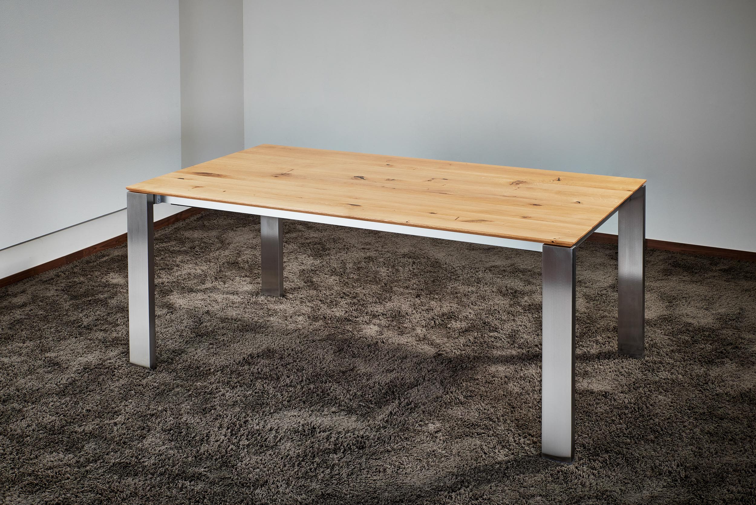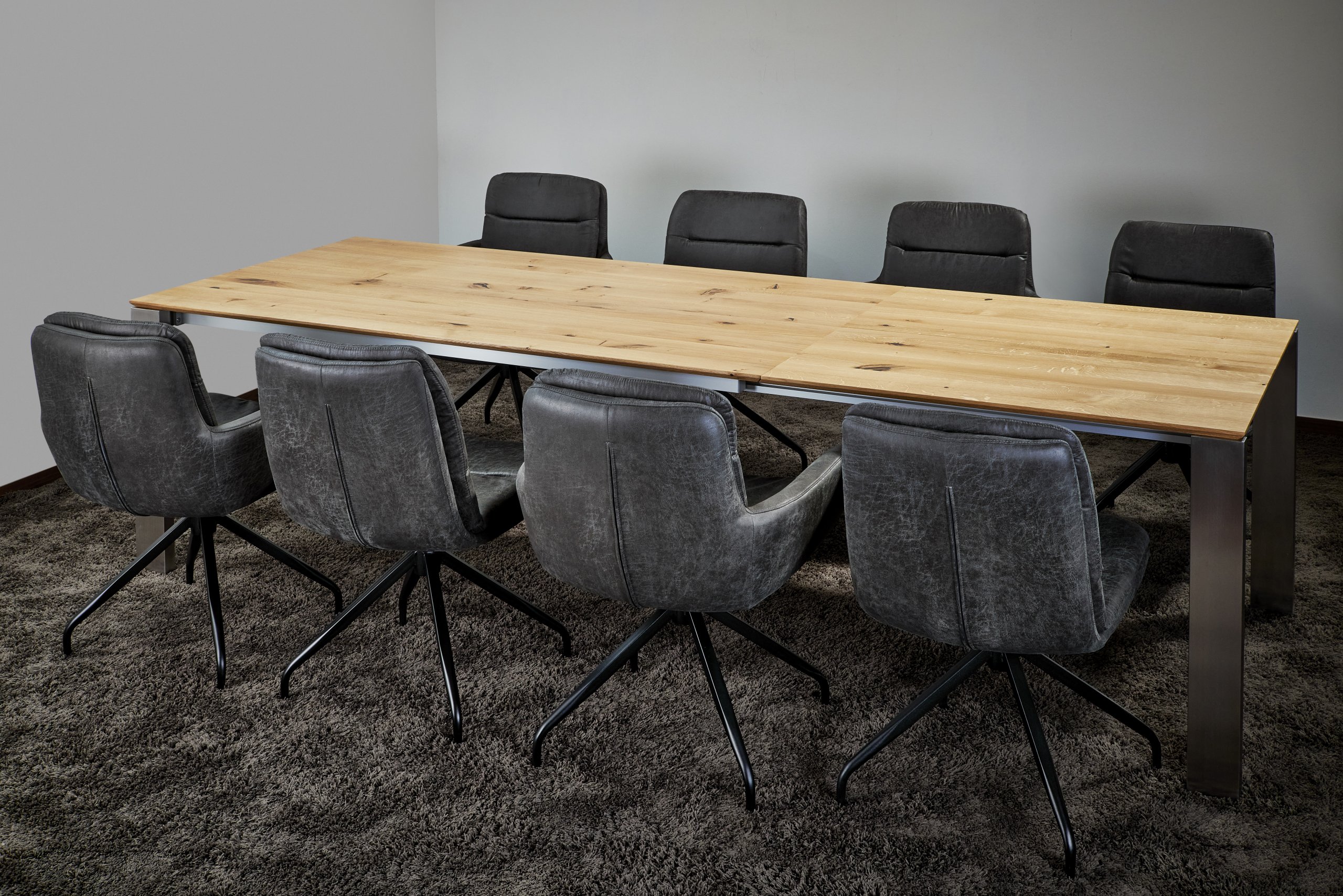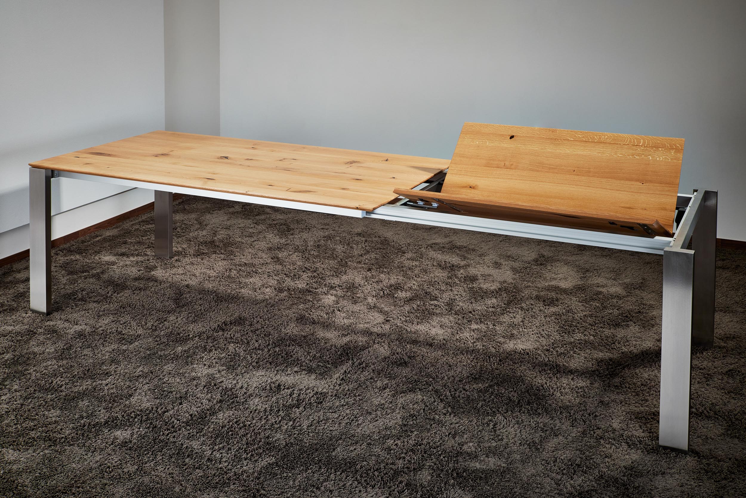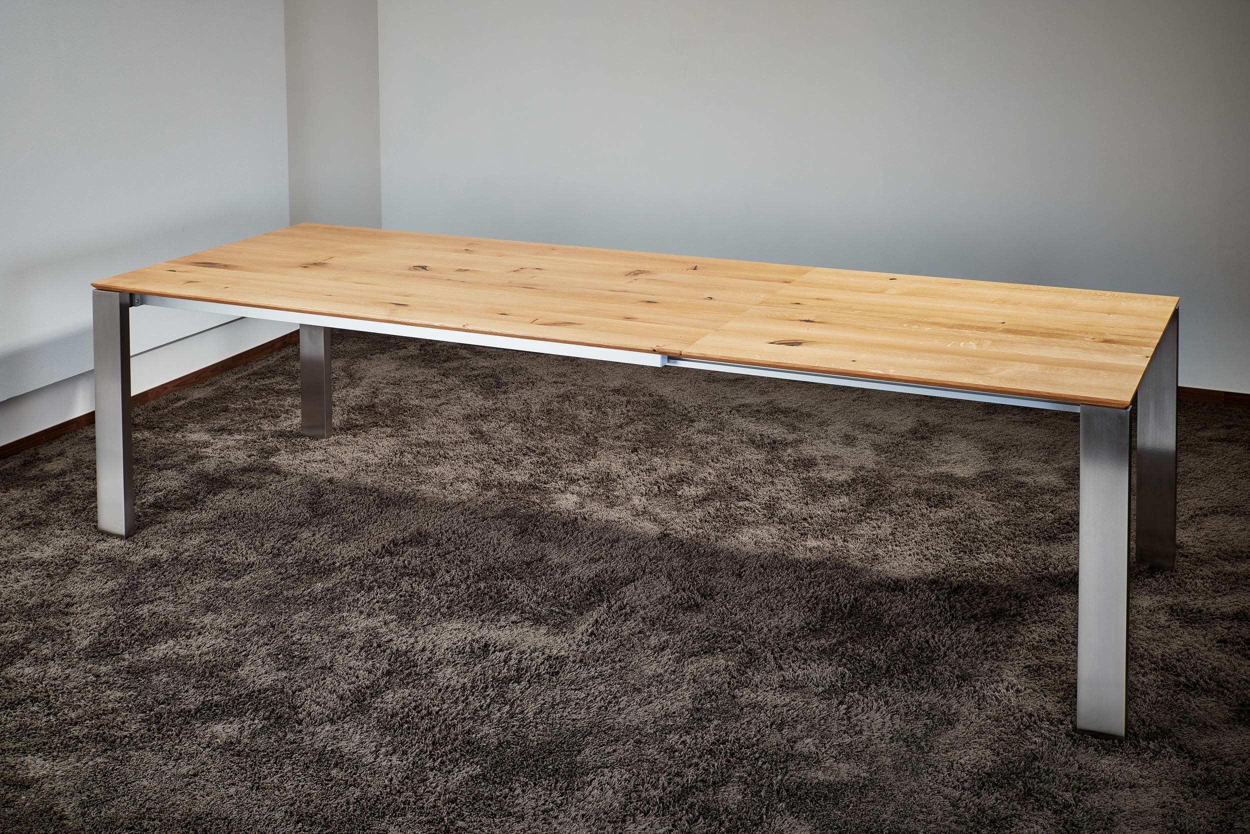 Esstisch ausziehbar Eiche massiv nach Maß individuelle Fertigung Gestell Edelstahl oder schwarz pulverbeschichtet Ausziehbarer Esstisch deutsche Fertigung nach Wunsch