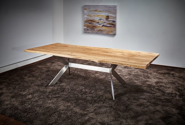 Suchen Sie einen außergewöhnlichen Esstisch nach Maß? In unserer Manufaktur im Sauerland fertigen wir Baumkanten-Esstische nach Kundenwunsch. Unsere Esstische mit Baumkante (oder Naturkante genannt) sind zeitlos-modern! Abgebildet sehen Sie unser Modell Arnsberg in einer Länge von 260 cm. Die Tischbreite variiert durch die „kurvige“ Baumkante zwischen ca. 98 cm und 108 cm. Die 4 cm starke, massive Eichen-Tischplatte wird von einem hochwertigen Edelstahl-X-Gestell mit Quertraverse getragen. Selbstverständlich passen wir die Maße Ihrer vorhandenen Einrichtung an: