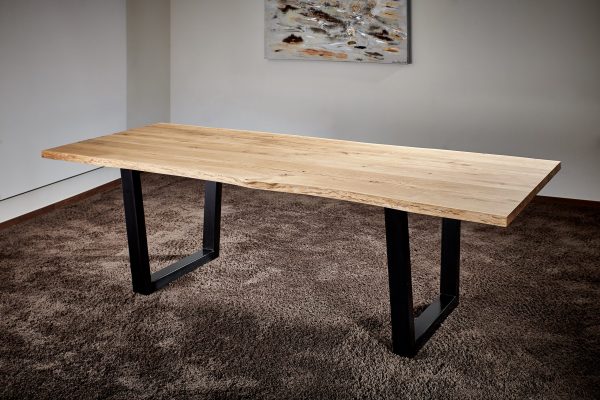 Natürlich, zeitlos und modern: Unser Esstisch „Arnsberg“ ist ein wunderschöner Hingucker und Mittelpunkt für jedes Esszimmer. Die Eichenplatte hat eine naturbelassene Baumkante, ist 4 cm stark, schwarz gespachtelt und die Oberfläche hat einen „Rohholz-Effekt“. Als Tischbeine sehen Sie hier die Trapez-Form in schwarz. Gern können Sie auch andere Tischbeine wählen. Dies gilt ebenso für das Tischmaß – wir fertigen nach Maß, nach Ihren Vorstellungen, abgestimmt auf Ihre vorhandene Einrichtung.