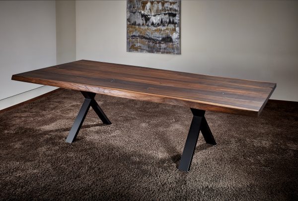 Unser Esstisch-Modell Schmallenberg ist ein wahrer Hingucker. Die Räuchereichen-Tischplatte ist 4 cm stark und besteht aus 4 – 5 Bohlen. Gern beziehen wir unsere Kunden ein: Sie dürfen in unserer Tischlerei mitentscheiden wie die einzelnen Bohlen gesetzt werden. Durch das Splintholz (hier zu sehen insbesondere bei der helleren Baumkante) erhält die Tischplatte eine einzigartige Optik. Gern können die Splintstreifen auch nach innen gesetzt werden. Das Spiel der Farbnuancen ist optisch sehr schön und harmonisch. Ein weiterer Clou sind die Zinneinlagen in den Astlöchern! Bei den Tischmaßen wählen Sie nach Wunsch, angepasst an Ihre vorhandene Einrichtung! 200 cm bis zu 280 cm Länge sind möglich. Die X-Beine (hier schwarz) sind optisch zeitlos und modern. Diese sind auch in Edelstahl erhältlich.